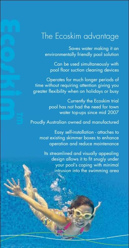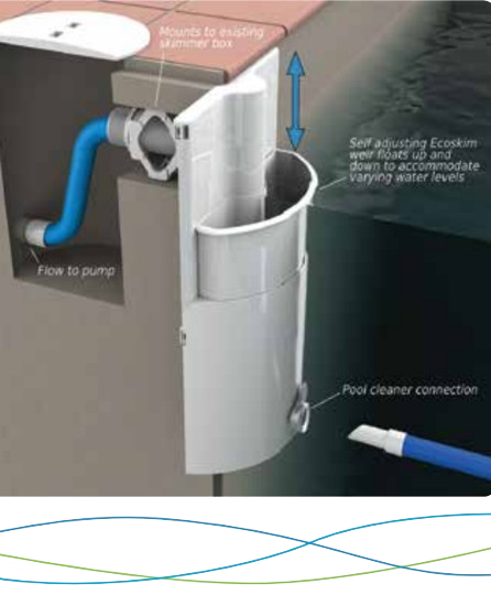 The Ecoskim attaches to existing pool skimmer boxes to allow for greater fluctuations in pool water levels due to evaporation and heavy rainfall – while improving water quality. And further enhancements to the Ecoskim have ensured that nobody entrapment could occur under any foreseeable circumstances.
