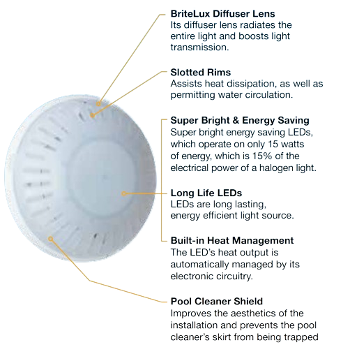 The Litestream LED under water light is modern in looks, and offers a warm white brightness and improved performance in pool coverage through its unique designed hexagonal diamond shaped lens pattern. Most importantly the Litestream LED light offers energy savings, operating on 15% of the electrical power of a halogen light.