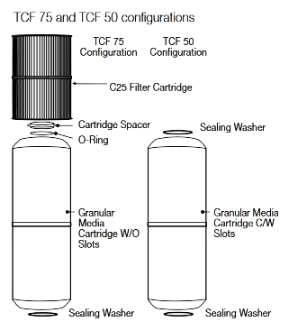 The granular media cartridges are able to house 12 litres of filter media and are designed to allow water to enter via the top of the cartridge and flow through the full height of the filter bed before exiting at the bottom ofthe cartridge.